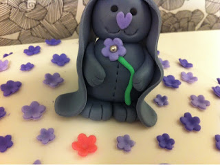 Doptårtor till lilla Maja har jag gjort denna helg. Majas mamma och jag pratade lite om vad som skulle vara på och kom fram till små kaniner, ljusgrå ville hon ha dem. Sen skulle en tårta gå i rosa och en i lila men i övrig typ likadana. Så så fick det blir. Två kaniner i hav av blommor.